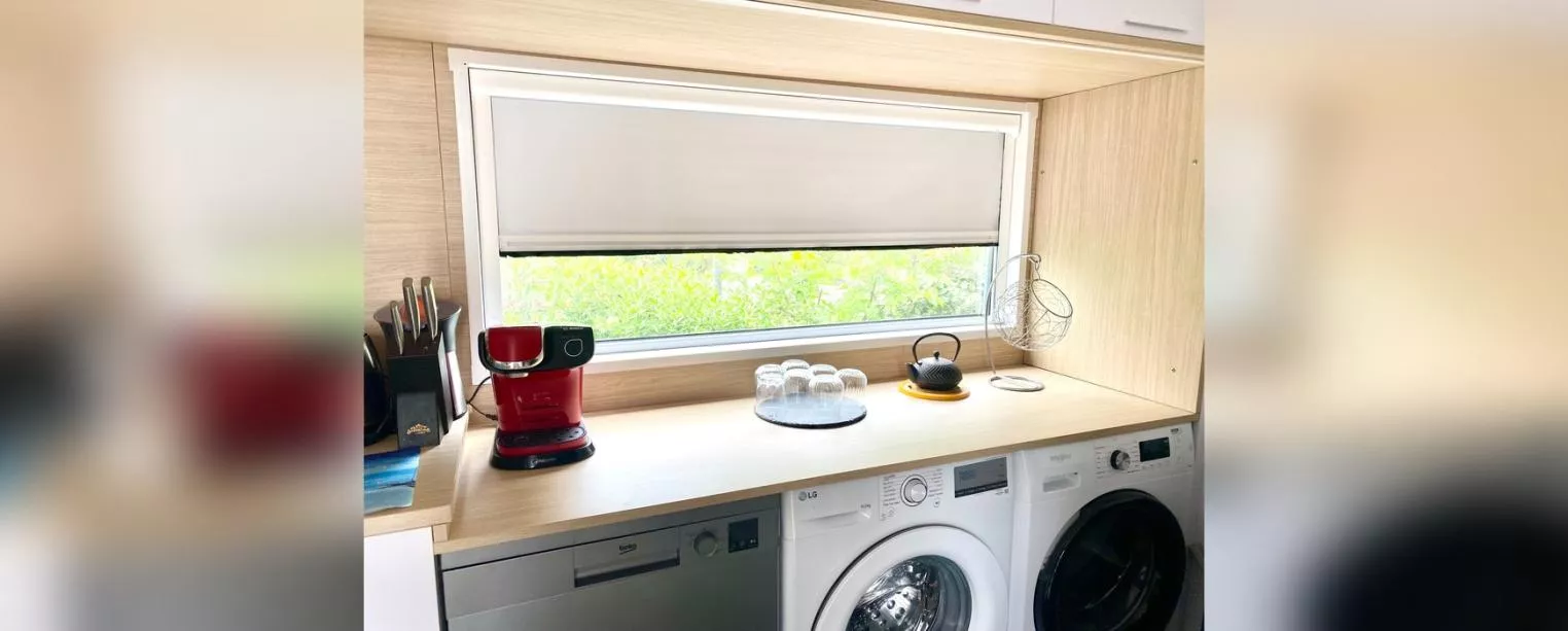 Estores opacos, que garantizan oscuridad y confort en los dormitorios de los mobil-homes.